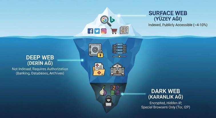 İnternet dünyası, çoğu kullanıcının sandığından çok daha derin ve çok katmanlı bir yapıya sahiptir. Günlük hayatta kullandığımız sosyal medya platformları, haber siteleri ve e-ticaret portalları; internetin yalnızca görünen yüzünü, yani “Surface Web”i oluşturur. Bu katman, toplam internet içeriğinin tahminen yalnızca %4 ila %10’unu kapsar.