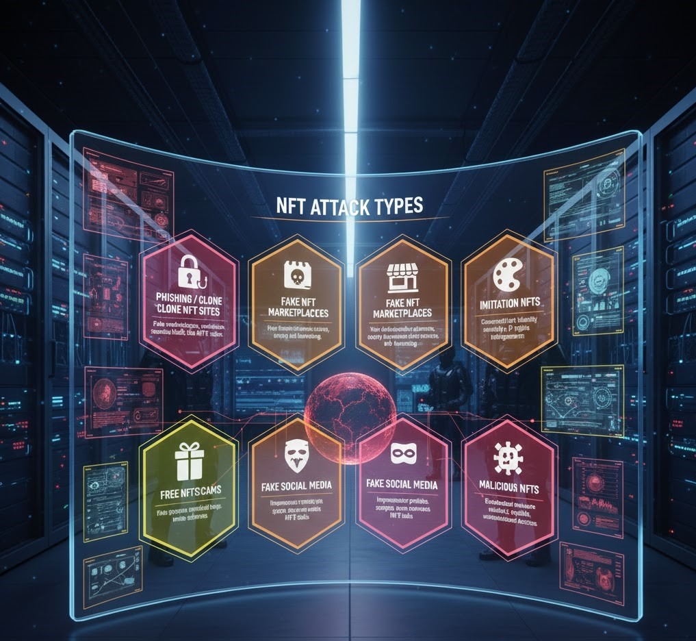 Her ne kadar blokzinciri teknolojisi NFT’ler için değiştirilemez ve şeffaf bir sahiplik yapısı sunsa da bu durum kullanıcıların tamamen güvende olduğu anlamına gelmemektedir. NFT ticaretinin ağırlıklı olarak çevrimiçi pazar yerleri üzerinden gerçekleştirilmesi, bu platformları siber saldırganlar için cazip hedefler hâline getirmektedir. Phishing saldırıları, sahte akıllı sözleşmeler ve sosyal mühendislik yöntemleri, hem pazaryerlerini hem de bireysel kullanıcıları tehdit eden başlıca riskler arasında yer almaktadır.