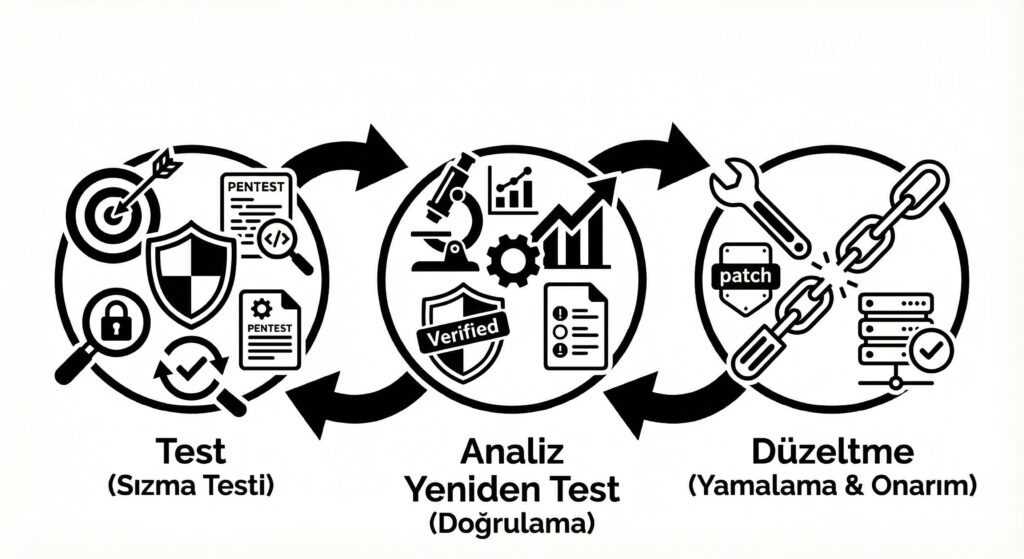 Pentest süreci yalnızca saldırı simülasyonu ile sınırlı kalmaz. Test sonrasında düzeltici faaliyetlerin uygulanması, ardından doğrulama testlerinin yapılması gerekir.