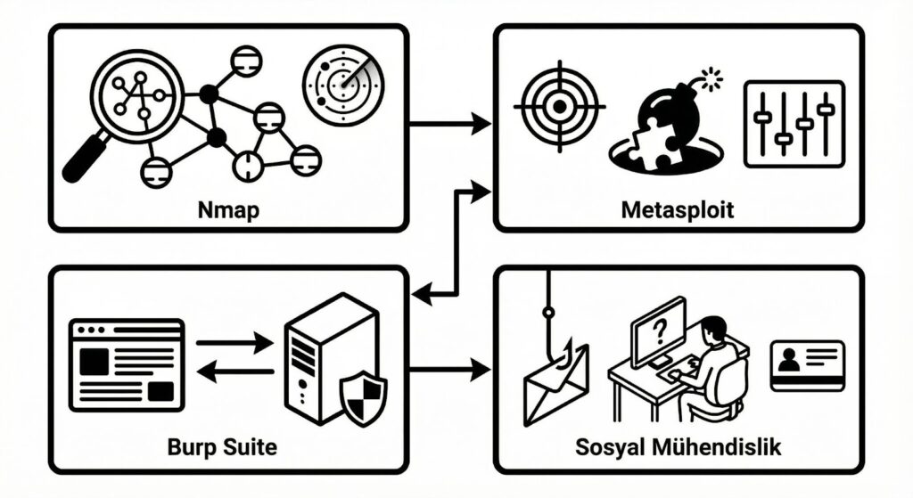 Bir sızma testi (pentest) sırasında etik hackerlar, hem keşif hem de istismar aşamalarında çeşitli araçlardan yararlanır. Bunların bazıları: