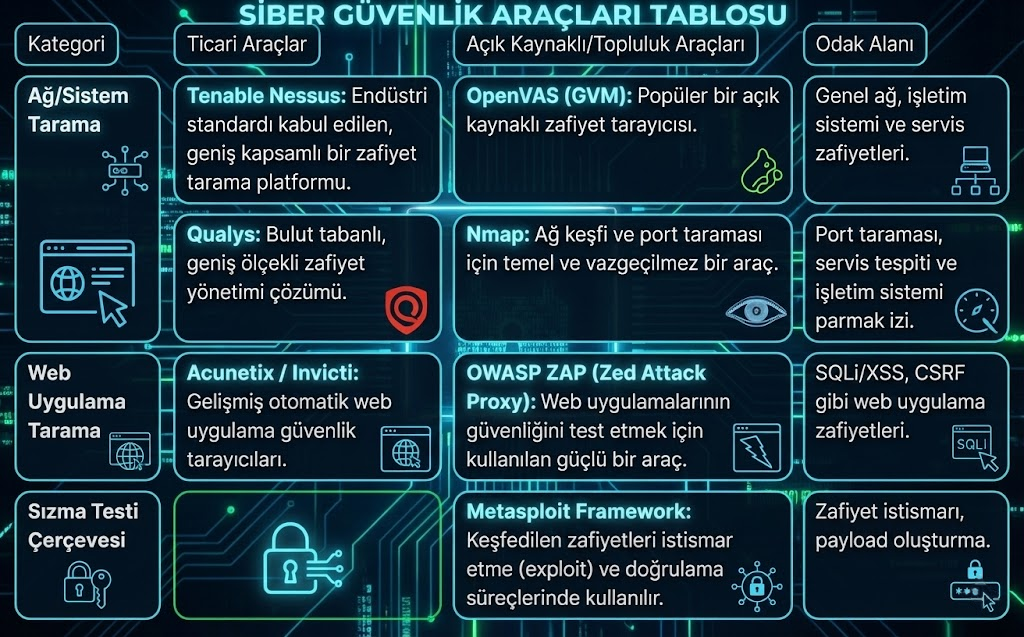 Zafiyet analizi sürecinde kullanılan araçlar genellikle ticari ve açık kaynaklı (Open-Source) olarak iki ana kategoriye ayrılır. Bu araçlar, ağ keşfinden detaylı sistem ve uygulama zafiyet analizine kadar geniş bir yelpazede hizmet sunar.