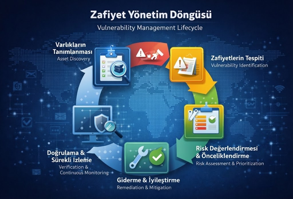Siber güvenlikte zafiyetlerin tespit edilmesi tek başına yeterli değildir. Asıl önemli olan, bu zafiyetlerin süreklilik arz eden, ölçülebilir ve yönetilebilir bir süreç içerisinde ele alınmasıdır. İşte bu yaklaşım, Zafiyet Yönetim Döngüsü (Vulnerability Management Lifecycle) olarak adlandırılır. Bu döngü, kurumların güvenlik açıklarını rastgele değil; planlı, sistematik ve sürdürülebilir bir şekilde yönetmesini sağlar.